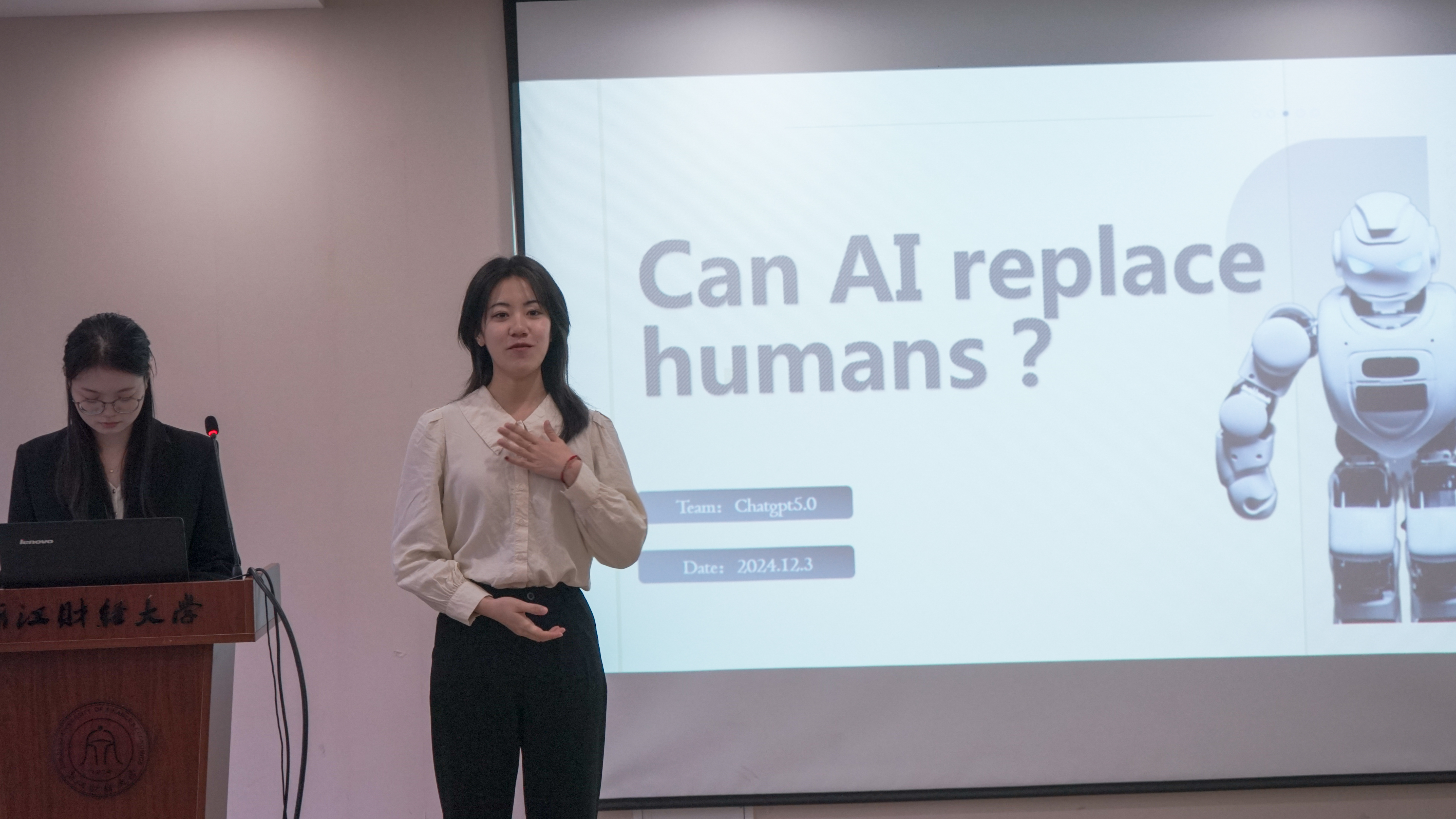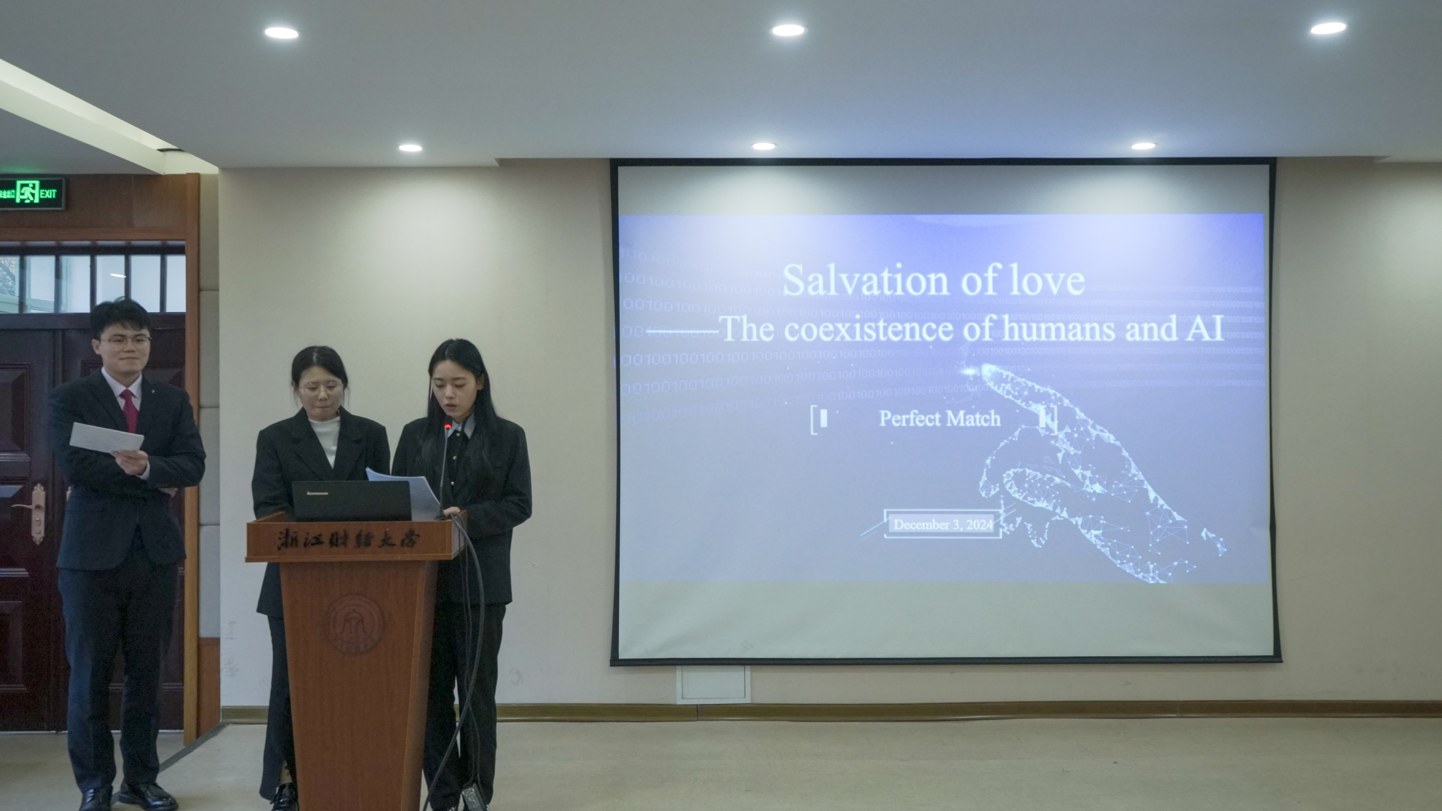 决赛流程紧凑而精彩。参赛选手首先就各自创作的复赛视频及背后的理念进行了英语陈述。在陈述过程中,各小组紧扣“AI与人类”的主题,充分展现了他们的才华和创意,并巧妙结合了PPT或视频辅助说明,思维清晰、观点新颖、语言流畅,使得整个陈述过程生动有趣,引人入胜。