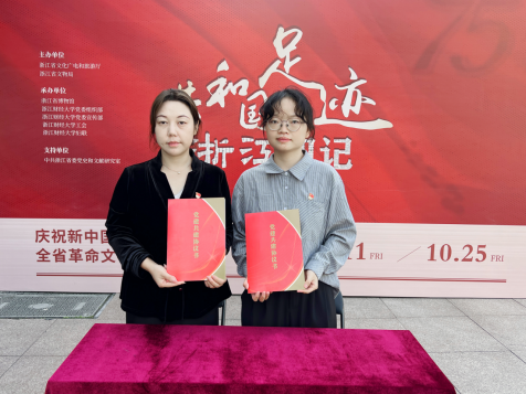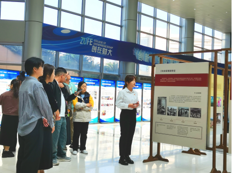 签约仪式后,本科生第二党支部党员与白杨街道云滨社区党支部党员及社区居民代表前往文化中心一楼大厅参观“共和国足迹·浙江印记”全省革命文物巡展,本科生第二党支部员工党员为社区代表做讲解,共同回顾浙江发展历程中的重要事件,了解革命先辈的奋斗精神,进一步加强了对党员的思想引领。